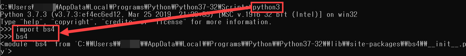 명령어를 이용하여 정상적으로 beatifulsoup4가 설치되었는지 확인