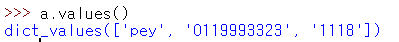 Key를 얻는 것과 마찬가지 방법으로 Value만 얻고 싶다면 values 함수를 사용하면 된다. values 함수를 호출하면 dict_values 객체를 돌려준다.