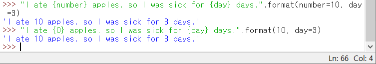 또한 {0}, {1}과 같은 인덱스 항목 대신 더 편리한 {name} 형태를 사용하는 방법과 인덱스 항목과 name=value 형태를 혼용하는 것도 가능하다!