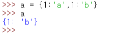 동일한 Key가 2개 존재할 경우 1:'a' 쌍이 무시된다.